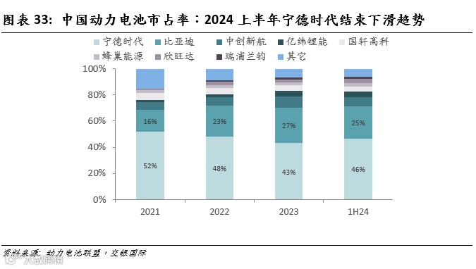 宁德时代在中国动力电池市占率常年位列第一。出于产能扩充与供应不足的焦虑,以及降本增效的考量,为加强对汽车产业链的自主掌控能力,长安、上汽、广汽、吉利等多家整车企业都明确提出自研、自建、合建、入股等方式切入动力电池领域。2021-23年,宁德时代在中国动力电池装车量的市占率从52%下滑至43%。2024上半年,宁德的市占结束多年的下滑趋势,升至46%。