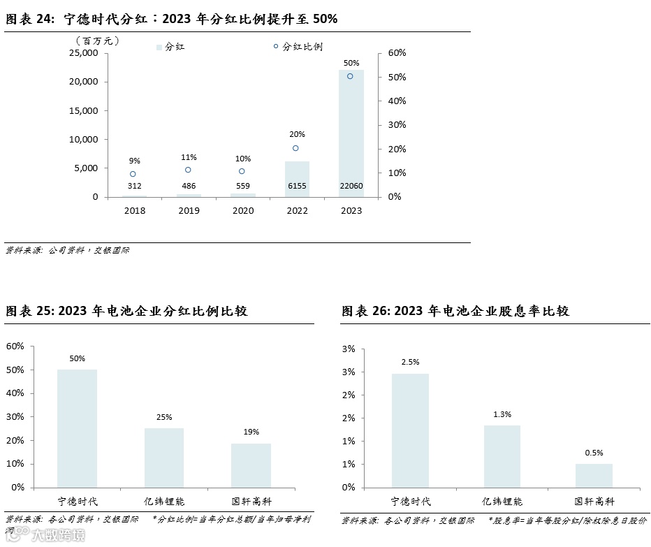 宁德时代重视投资者回报,自上市以来持续进行现金分红,累计分红金额已达296亿元,其中2018-21年累计已实施的现金分红不低于期内累计实现的合并归母净利润的10%;2022年度公司进一步提高投资者回报,将现金分红比例提升至20%,共计派发61.55亿元现金分红。2023年度向全体股东每 10 股派发年度现金分红和特别现金分红50.28 元(含税),合计派发现金分红 221 亿元,现金分红比例进一步提升至50%。2023年主要电池企业中仅宁德时代、亿纬锂能和国轩高科实现分红,三家企业的分红比例分别为50%/25%/19%,股息率分别为2.5%/1.3%/0.5%,宁德时代的分红比例领先于行业。
