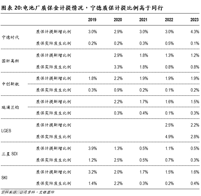 宁德时代的质保相关的计提比行业内其他公司更为严格。2019-23年,宁德时代质保金计提费率维持在3.0-4.3%,实际发生比例为0.1-0.5%。同期国内二线电池厂商和海外电池厂质保金计提比例普遍呈现下降趋势,2023年国轩高科/中创新航/瑞浦兰钧的计提比例为1.2%/1.9%/1.5%。海外电池厂商计提更为宽松,2023年三星SDI和SKI的计提比例为0.5%/1.6%,LGES连续两年实际发生费用大于计提费用,2023年当期计提率仅为2.2%,而实际发生率占比2.8%。