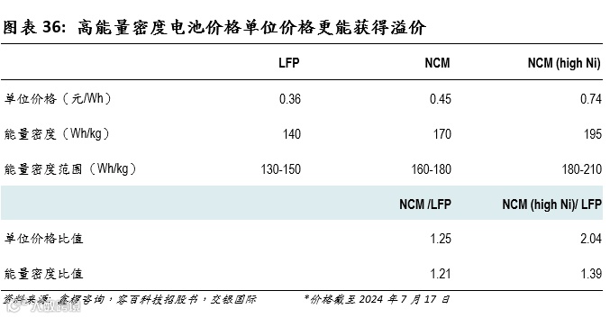 能量密度是动力电池最重要的衡量标准之一,也是宁德时代电池能够溢价的主要原因之一。以高镍三元为例,其能量密度是LFP的1.39倍,但是单价却是其2.04倍。乘用车动力电池领域,宁德时代的神行电池(LFP)/麒麟电池(NCM),能量密度达 205/255 Wh/kg,领先于其他电池产品。2024年中报业绩电话会中,公司表示麒麟电池和神行电池当前出货量占比在30-40%左右,预计将持续提升出货份额。随着这两款电池放量,装机占比逐渐提升。