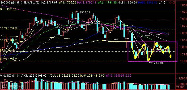 创业板在之前的分析就已经强调,其走势多会在黄金分割位1750与144日均线1817形成的区间来回震荡。目前冲高回落,有走向1750的预期。