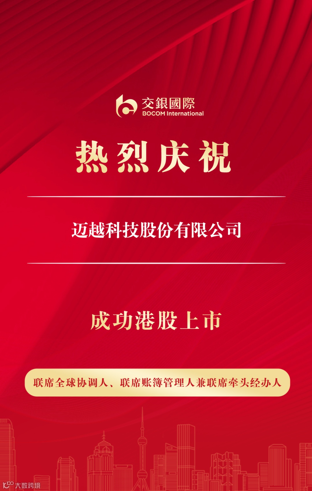 10月11日,迈越科技股份有限公司(“迈越科技”,2501.HK)在香港联交所主板挂牌上市。迈越科技本次全球发售定价每股1.18港元,香港公开发售获2.46倍认购。交银国际担任联席全球协调人、联席账簿管理人兼联席牵头经办人,助力迈越科技成功登陆港股市场。