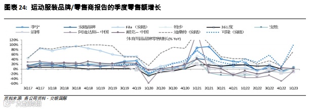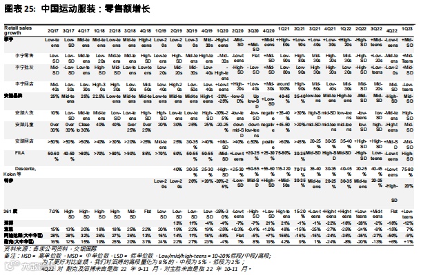 近期趋势:2023年1季度,运动服装公司的销售正在缓慢但渐进地复苏,在去库存方面取得进展,有望在2023年中达到健康的渠道库存。折扣幅度也正在改善,库存水平下降。不同的品牌有不同的表现,特步和361以双位数的销售额增长成为增长最快的品牌,而安踏和李宁的核心品牌增长较慢,仅为中个位数的增长,但安踏受益于增长更快的小品牌,例如FILA(同比增长高个位数)和户外品牌Descente和Kolon(同比增长75-80%)。