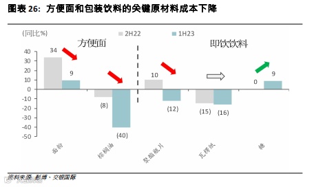 食品饮料的成本趋势继续往下。商品成本的下降,包括面粉、棕榈油、PET、糖和瓦楞纤维板,有利方便面和即饮饮料的利润率。总体而言,2022年的产品提价将在2023年成为额外的毛利率推动力。