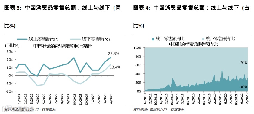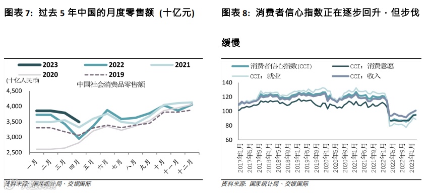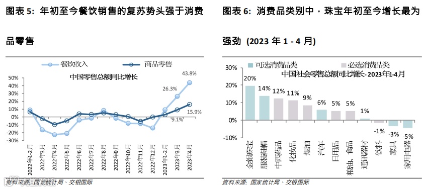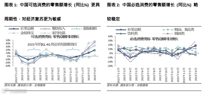 2023年的有利因素仍然存在,但其强度可能会减弱……在我们今年初发布的2023年行业展望中(消费行业 - 2023年展望:成本通胀缓和,消费回升蓄势待发,于2023年1月16日发布),我们预计消费行业将在2023年强劲复苏,动力来自1)中国经济重启后的“报复性消费”,特别是2季度有低基数效应;2)原材料成本回落将提振利润率,尤其对于必选消费公司。事实证明,自中国经济重启以来,中国零售销售年初至今强劲复苏,4月份销售额同比增长18.4%(3月份为+10.6%),这得益于线下销售的复苏,从路边商店、购物中心到餐馆/夜生活渠道的客流量都全面回升。线上销售在1-2月相对疲软(+7%),但增速也开始加快,4月增长22%。2季度以及4季度的低基数效应将继续支撑全国的零售额增长。
