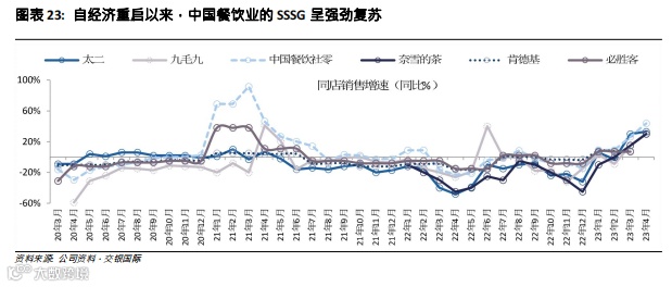 消费复常后全行业录得强劲复苏:自经济重启以来,整个餐饮业呈现出良好的复苏。2023年4月的餐饮业零售额同比增长44%,比2019年4月(疫情前)的水平高出14%。各种上市的餐厅/咖啡馆连锁店在4月份的同店销售额同比增长了40%以上,在5月劳动节假期期间增长了30-40%。