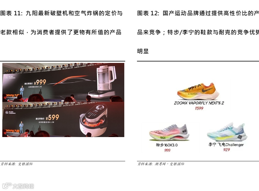 通过以不变价格推出新升级产品来提高性价比的例子:小型厨房电器龙头九阳(002242 CH/未评级)在4月底推出了四款新产品,包括最新版本的电饭煲、空气炸锅、破壁机和豆浆机,这些产品包含了重大的技术改进,但定价都很有竞争力,与其旧版产品差不多。2023年家电市场仍然疲弱,这与房地产市场低迷有关,九阳1季度的销售额同比下降了19%。九阳管理层表示,消费者支出仍然疲软,这是他们为新产品定价时的一个考虑因素。