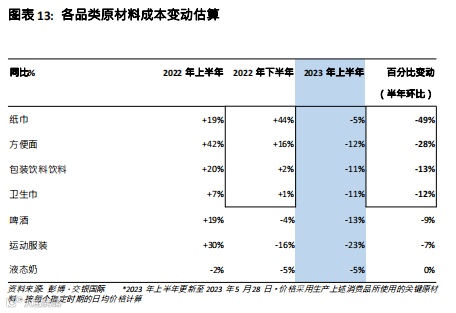 所有品类的成本压力都进一步缓解,但纸巾和方便面生产商的成本改善最为明显:2023上半年,我们追踪的所有消费类别的关键原材料成本都进一步下降,其中降幅最大的是2022下半年成本压力最大的品类,如纸巾、方便面、即饮饮料和卫生巾。