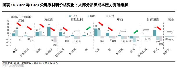 根据我们对2023上半年日均价格的计算,纸巾/方便面/即饮饮料/卫生巾原材料成本分别同比下降5%/12%/11%/ 11%,而2022下半年均为同比上涨。此外,啤酒、运动服装和液态奶的原材料成本也继续同比下降,分别下降了13%、23%和5%,继续利好必选消费企业的毛利率。