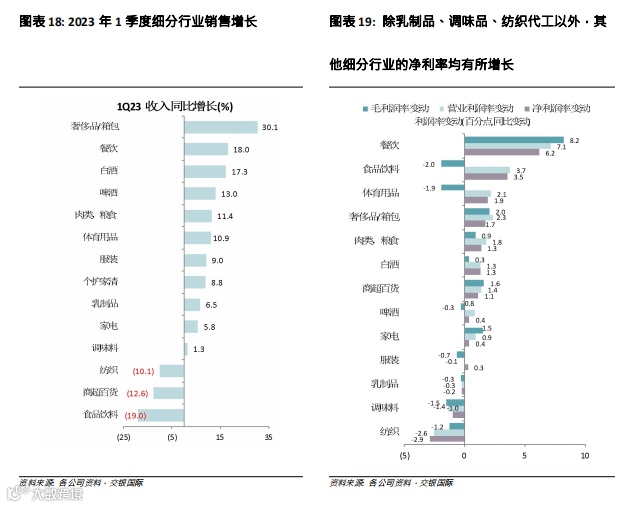 51家消费公司的1季度业绩:我们研究了来自14个细分行业51家内地公司的1季度销售和利润率趋势。奢侈品/箱包的销售增长最为强劲(同比增长30%),其次是餐厅(18%)、白酒(17%)、啤酒(13%)、肉类(11%)、体育用品(11%)和服装(9%),而食品饮料销售疲软(同比下降19%)。整体情况与中国全国零售销售按类别增长一致,其中珠宝和餐厅排名第一(同比增长20%),服装/鞋类排名第三(同比增长14%),而饮料类零售销售同比下降1%。利润率方面,餐厅的毛利率和经营利润率也出现了强劲反弹。除乳制品、调味品和服装代工外,大多数细分行业的利润率在1季度均有所改善。