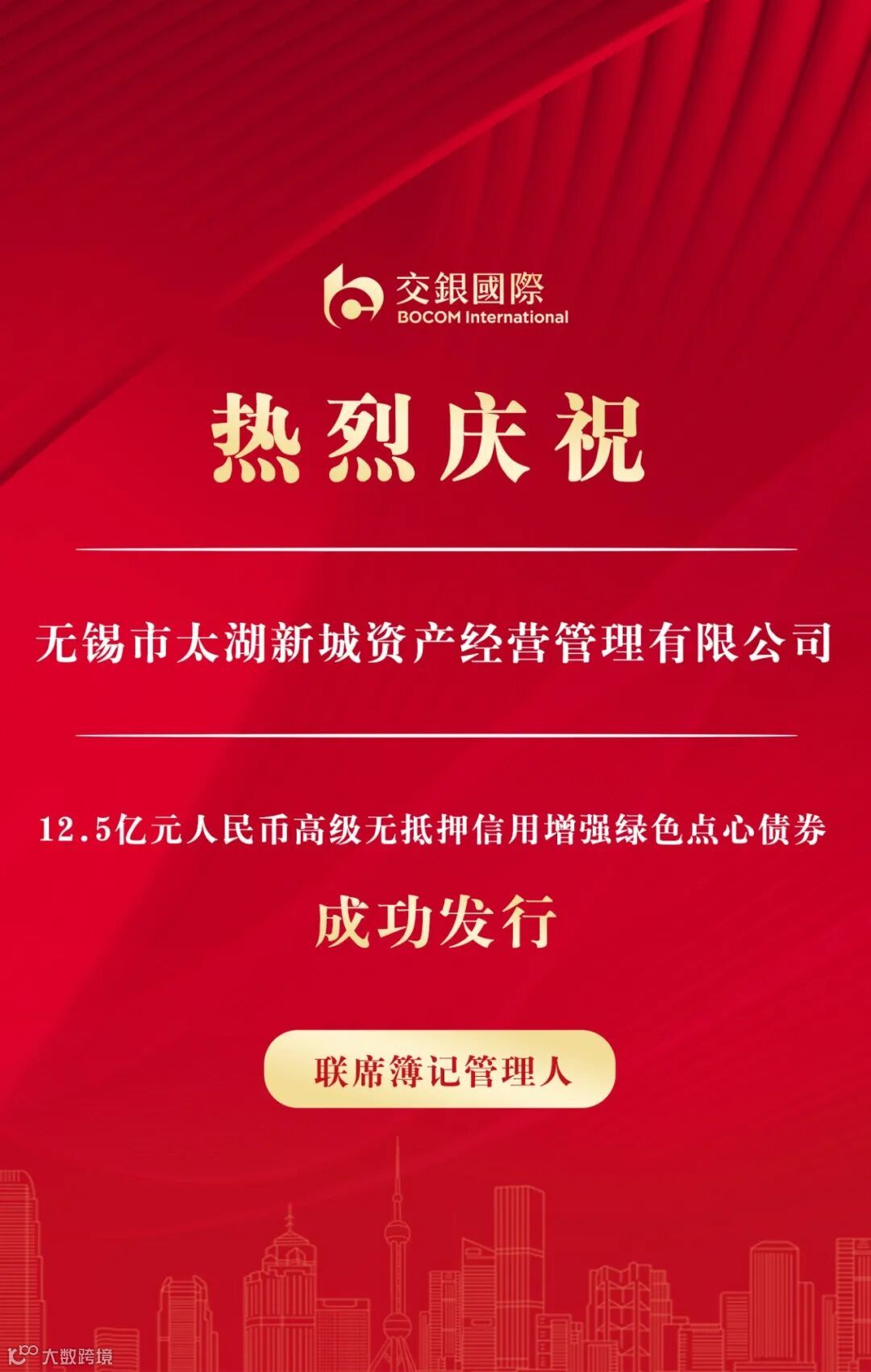 同日,交银国际作为联席簿记管理人助力无锡市太湖新城资产经营管理有限公司(“太湖新城资管”)成功发行3年期12.5亿元人民币高级无抵押信用增强绿色点心债券,该笔债券由中国邮储银行无锡分行提供备证,票面及发行收益率3.60%。交银国际在此笔绿色点心债券发行中,快速准确锁定适当的国际投资者,获得委任后,积极协调投资者锚定价格,第一时间协助发行人夯实基石订单。该笔交易获得境内外投资机构的广泛关注,订单认购峰值达4.43倍,最终价格较初始价格指导4.1%区间大幅收窄50个基点。