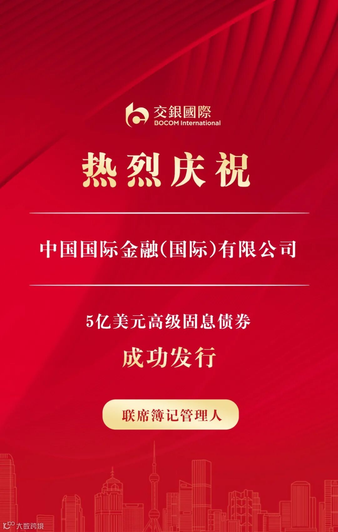 7月12日,交银国际作为联席簿记管理人助力中国国际金融(国际)有限公司(“中金公司”)成功发行3年期5亿美元高级固息债券,票面及发行收益率为5.442%。本次债券新发是交银国际首次参与中金公司境外债券发行,拓宽了双方合作领域,开启了在境外债券资本市场合作共赢的新篇章。该笔交易获得投资者的极大关注和兴趣,账簿峰值超过26亿美元,超额认购峰值达5倍以上,最终价格较初始定价大幅收窄35个基点,圆满完成目标发行量。此次发行投资者覆盖范围广、资质优,二级市场表现良好。