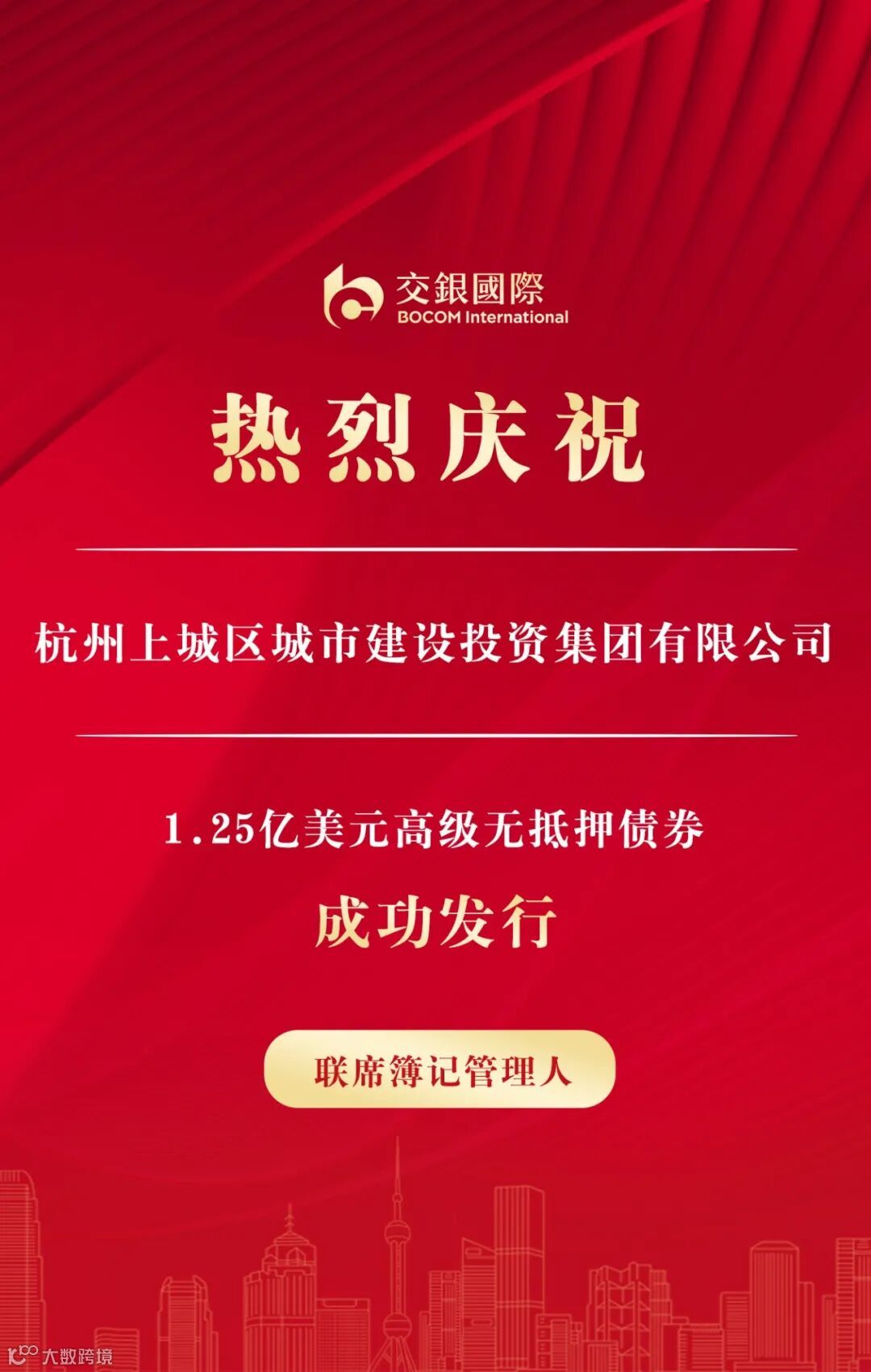 7月11日,交银国际作为联席簿记管理人助力杭州上城区城市建设投资集团有限公司(“杭州上城城建”)成功增发1.25亿美元高级无抵押债券,票息5.90%。发行人以初始价格指导6.70%区间向市场打开簿记,在坚实基石订单支持下,最终发行收益率为6.50%。此次发行是交银国际继2022年协助公司发行美元债以来,第三次参与公司的境外债发行工作,双方进一步深化了银企关系。