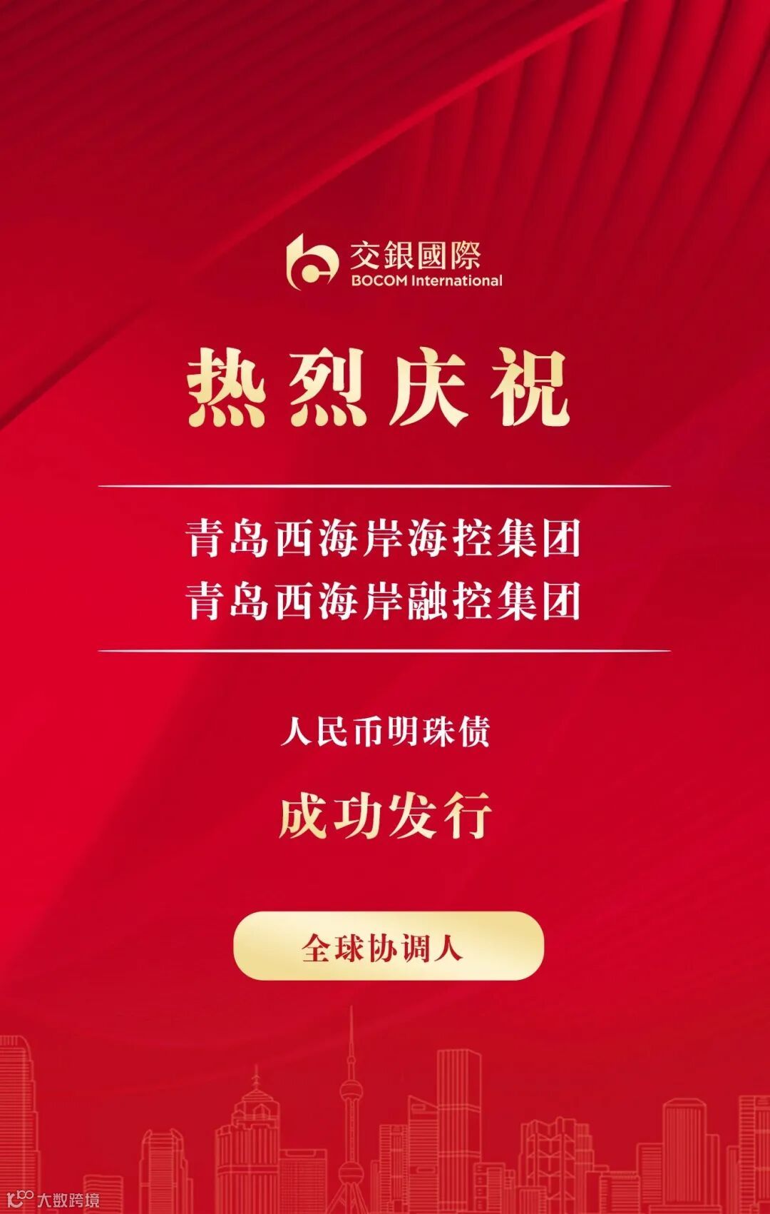 3月24日,交银国际作为全球协调人助力青岛西海岸新区融合控股集团有限公司(“青岛西海岸融控集团”)成功发行3年期4亿人民币高级无抵押自贸区离岸债券,票面及发行收益率5.4%。发行收益率较初始价格指导收窄60个基点并成功募集4亿元人民币,创青岛地区明珠债信用发行最低收益率之一,同时创青岛地区明珠债最大收窄幅度。