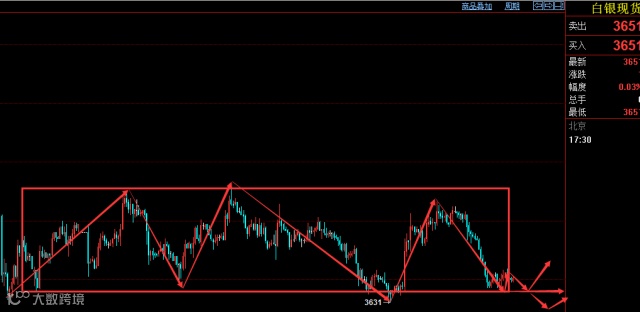 目前白银技术形态上,走势再次回踩到前期中枢震荡的底部区域3631-3640附近,这是第四次回踩该支撑位,从目前技术走势看白银的走势还是非常弱势,很有可能被击穿。所以我们要密切关注周末消息面的影响,如果没有出现重大利好消息的话行情有可能会弱势震荡,跌破中枢底部的支撑。不过下方的空间不大,击穿后行情很可能出现盘整背驰,后面有望迎来一波反弹。