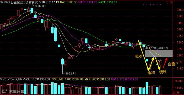 今日早盘券商直线上涨拉开反弹帷幕,而后钢铁煤炭与房地产等权重锦上添花,助力大盘下探回升并持续走高,收盘收上5日线,走势有所企稳。目前大盘经历图中的常规止跌节奏急跌-缓和-缓跌,没有进一步扩大跌幅,配上权重加持,走势有好转的迹象。但确切走强还需要进一步走高,并且需要成交量配合。