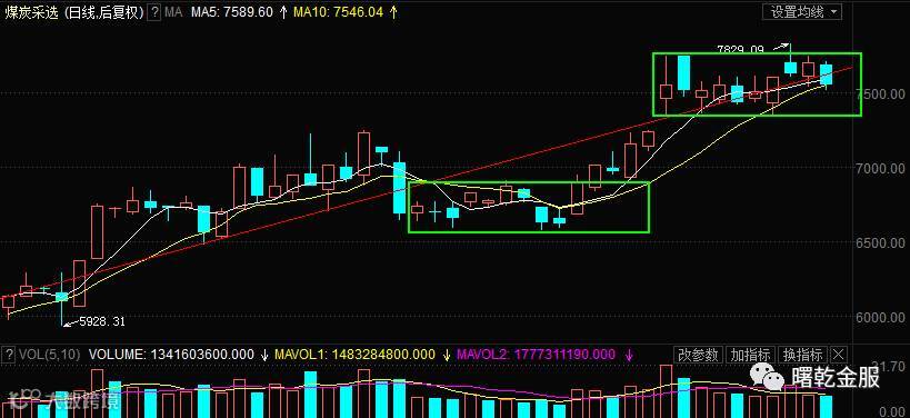 今日金融类与资源类板块双双走低,市场要重新走强,离不开这2大类板块的贡献。上图为煤炭的走势,关注其箱体调整后的方向抉择。
