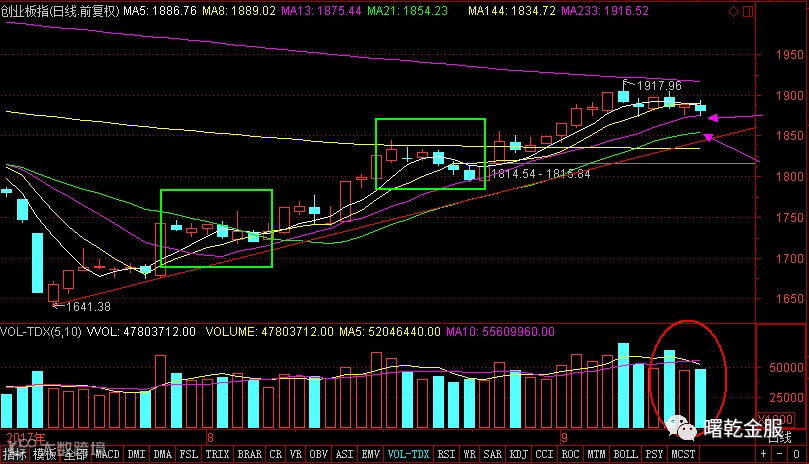 创业板如昨日所分析的, 走出了第6个交易日的调整,并且刚好精准的踩实了13日均线,节奏上用了个基本的5浪的结构。