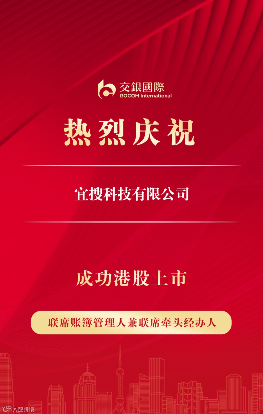 6月7日,宜搜科技有限公司(“宜搜科技”,2550.HK)在香港联交所主板挂牌上市。宜搜科技本次全球发售定价每股5.80港元,发行14,802,500股。交银国际担任联席账簿管理人兼联席牵头经办人,助力宜搜科技登陆港股市场。