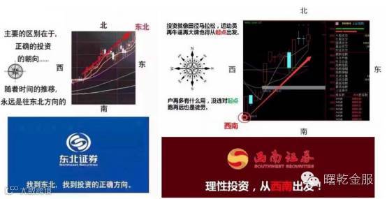 东北证券的广告标语:找到东北,找到投资的正确方向!而西南证券表示这个锅我不背,马上反击:理性投资,从西南出发!东北追涨,西南抄底,可怜的东南证券哭晕在厕所!