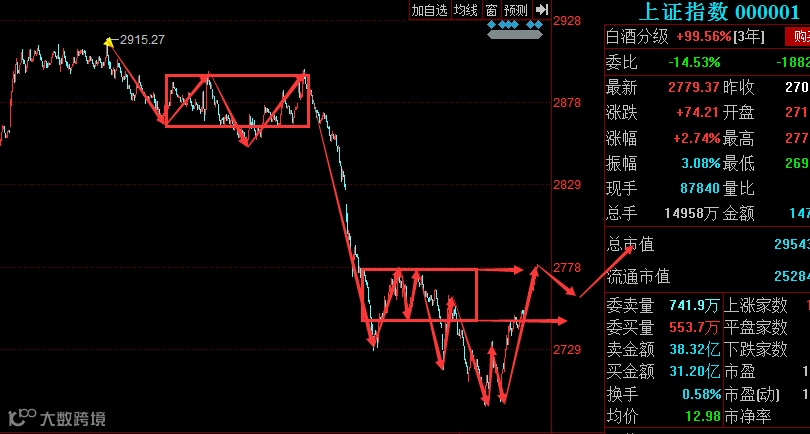 大盘从2915下跌以来,已经走出了两个五分钟级别的笔中枢,在前期的文章里面我说过,指数一分钟的反弹有望构建一个五分钟的中枢,目前已经完美走出。昨天的新低和二次回踩让五分钟的趋势背驰更加明显,这是引发今天反弹的技术保障。