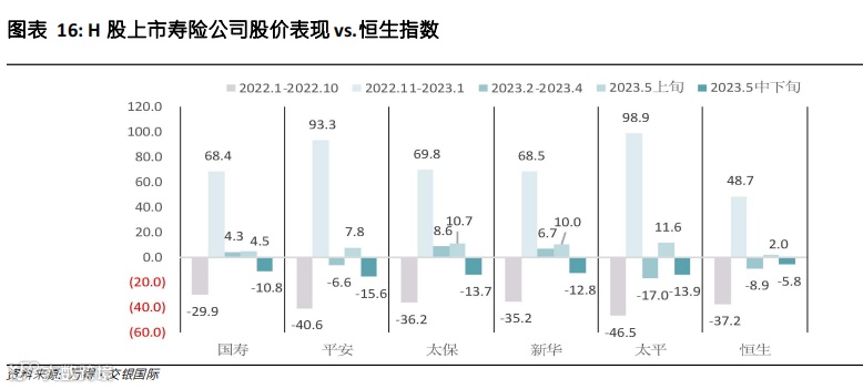 4) 业绩驱动+中特估催化上涨阶段2023.5上旬:2023年1季度寿险行业资产端和负债端均超预期,同时受益于中特估行情,股价呈普涨局面,5月初至5月8日,平均上涨9%左右,同期恒指上涨2%。