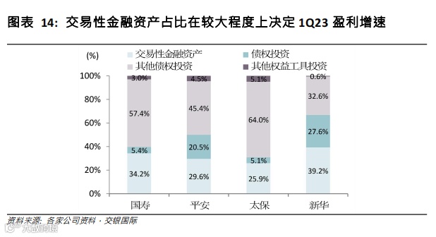 新准则下,2023年1季度上市寿险公司净利润同比显著增长。太保、平安、国寿和新华同比分别增长27%、49%、78%和115%。国寿披露旧准则下盈利增速为18%。新金融工具准则下,更多股权投资资产将被分类为FVTPL,公允值变动更为剧烈,而1季度股票市场回暖,正向公允值变动相对更大。从新准则下金融资产分类来看,新华和国寿交易性金融资产占比显著高于平安和太保,受益于资本市场回暖,新华和国寿盈利增速相对高于平安和太保。