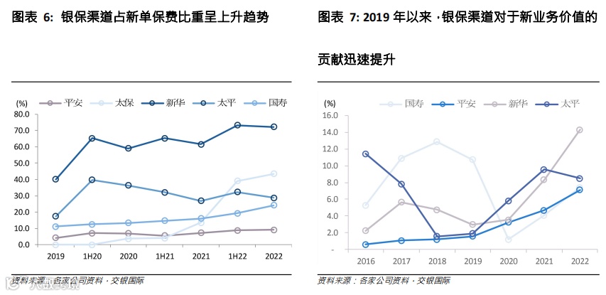 2019年以来,银保渠道对于新业务价值的贡献呈提升趋势。从银保渠道占新业务价值的比重来看,新华从2019年的3.0%提高到2022年的14.3%,提升幅度最为显著,平安和太平2022年分别较2019年提高5.5和6.6个百分点;国寿2017-19年银保渠道贡献新业务价值10%左右,2020年显著下降,但2022年占比较2020年提升6个百分点。
