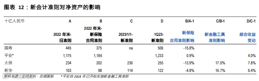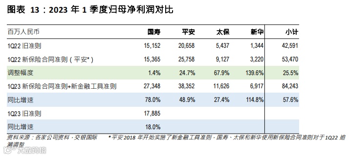 新会计准则对于净资产的影响。上市寿险公司对2022年末财务数据按照新保险合同准则实施追溯调整,相比旧准则净资产普遍下降,主要受到准备金折现率变化和使用VFA计量分红险保险合同负债的影响。新金融工具准则的实施,较大部分的债权投资资产由摊余成本改为公允值计量,有所增值,提升了净资产。2023年1季末净资产较1月1日新准则调整后的净资产增加,平安、太保和新华分别增长4.0%、7.8%和6.4%。新准则下,大部分股票投资被分类为FVTPL,受益于1季度股票市场回暖,投资收益带动盈利显著增长。