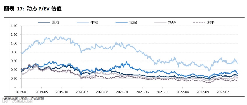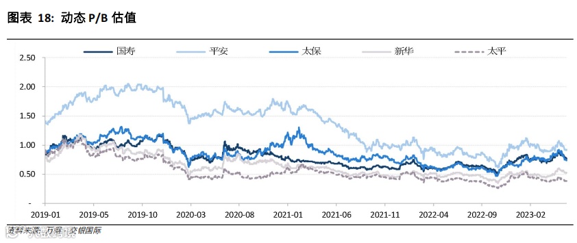 由于1季度产品结构以储蓄型保险为主,估计新业务价值率延续下降趋势。从新业务价值率来看,2020-22年受疫情和产品结构变化影响,新业务价值率持续下滑。2023年1季度,新单保费增长主要来自储蓄险和银保渠道,估计新业务价值率仍同比下降。平安1季度新业务价值率同比下降3.7个百分点。