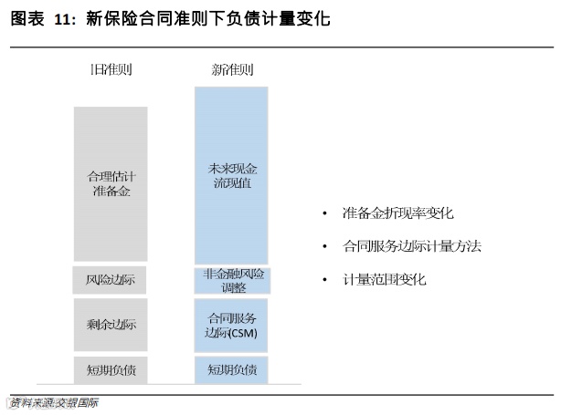 2023年开始,上市保险公司正式实施新会计准则。新会计准则包括新金融工具准则和新保险合同准则。根据新金融工具准则,金融资产重新分类,投资收益波动总体会加大;新保险合同准则相比旧准则的变化主要体现在准备金折现率曲线和合同服务边际的吸收能力(传统险适用通用模型,分红险等适用浮动收费法)。新准则的实施对于资产、负债匹配能力提出更高的要求,寿险公司之间不同的业务结构将对于财务表现具有较大影响。