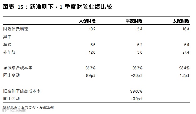 1季度财险公司表现有所分化,平安财险逊色同业,主要受到信用保证险的拖累。1季度人保、平安和太保车险保费增速均为6%左右,非车险增速表现分化,太保和人保仍保持较为快速的增长,平安受信用保证险的拖累非车险增速显著放缓;从新准则下承保综合成本率来看,人保和太保同比下降,但平安同比上升,主要也是受到信用保证险业务拖累,公司在年报业绩会披露,信用保证险的影响2024年有望出清。