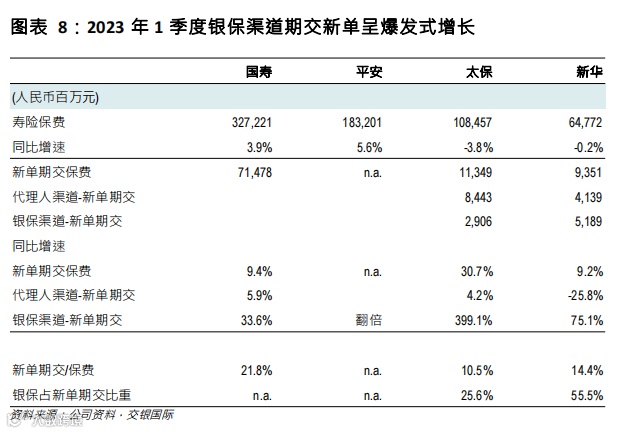 2023年1季度银保渠道新单期交保费增长强劲。1季度国寿和新华银保渠道新单期交保费同比分别增长34%和75%,平安为翻倍增长,太保同比增长4倍。新华银保渠道新单期交已经占到新单期交保费的56%。我们认为银保渠道期交保费增长强劲主要有以下几个原因:1)1季度居民对储蓄险需求增长强劲,而银保渠道具有庞大的客户基础和广泛渠道,较为匹配储蓄险的销售;2)银行的理财业务中收表现低迷,银行更为重视代理保险业务带来的手续费收入,且期交业务具有更好的持续性。
