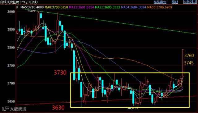 华通银昨晚强势上涨的两个原因,第一是走势向上突破了箱体上轨3730,上涨格局基本确立;第二,由于中美贸易战与叙利亚局势紧张,使得市场的避险情绪相对较高,进一步催化了行情的上涨。