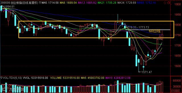 创业板本周表现相当抢眼,之前在低位形成双底之后,本周强势上攻,不仅确认双底的有效,还直接攻破60日线,恰恰高出1个点的空间。预计明日还会在60日线有一番争夺,短线持续上涨后,调整一下的概率会更大。