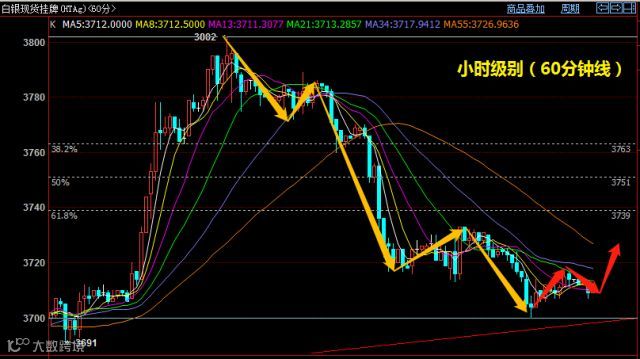 上图是小时级别的走势。从浪形结构上看,从高位回落用了5浪的结构,短线如果就此借助3700重要支撑位反弹,多将演变出abc三浪的上涨结构。而如果走高,上方两个重要的压力位需要注意,分别是3730与3739。3739是图中黄金分割线的点位,这是反弹的基本点位。如果走势不如预期而走低,那么跌破3700,还将向下冲击3680。