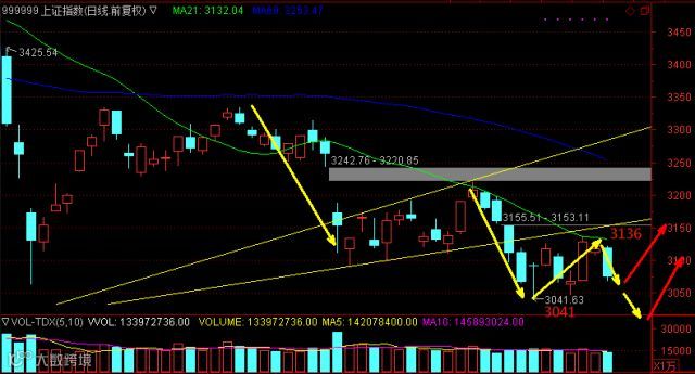目前整体的下跌走势已经缓和了很多,近期在3041的双底由于没有突破3136而没能成形。后市以21日均线3136作为上涨的研判,如果突破这一线,基本可以确认下跌波段的完结,上涨波段的走出。而下方,以前低3041做研判,一旦跌破,则还将进一步走低。不过如果往下破位,预计下跌的空间是有限的,毕竟大级别的下降格局,空头的势能减弱了很多,再跌之后酝酿出波段性的上涨概率不小。