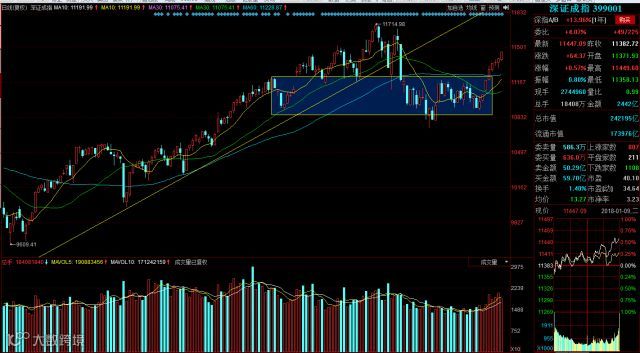 深成指今日走势继续上涨收光头阳柱,成交量较前一日略有缩量。