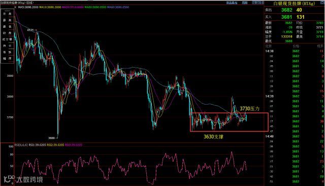 白银从日线级别来看,价格仍然处于3730-3630大区间横盘震荡,同时昨日晚间美元指数低位反弹走高,白银高位回落,截止到目前收盘,行情以一根中阴柱报收。