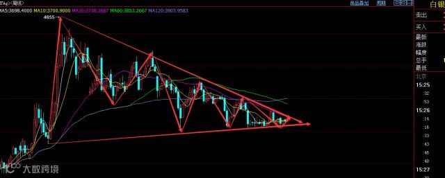 从图中我们看出,白银从2016年反弹到最高点4655以来,由于美联储开始持续加息,白银从高位开始不断的调整,每次反弹的高度在下降。经过两年时间的震荡调整,目前周线级别已经走到收敛三角形的顶部位置,震荡幅度越来越窄,说明市场周线级别变盘时间点即将出现,预计下周美联储加息兑现后就是变盘的转折点,个人预计往上变概率大,所以大的机会近在眼前。