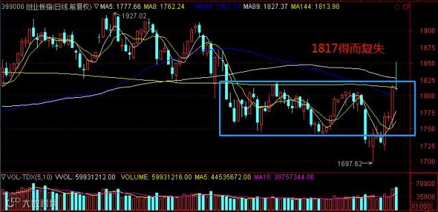 创业板重要的研判位是1817,昨天精准碰位,今天强势突破后最终还是收回,没有能成功站上去。冲高回落之后留下长长的下影线,明天还有惯性下探的节奏,预计需要回调,回踩下5日线。