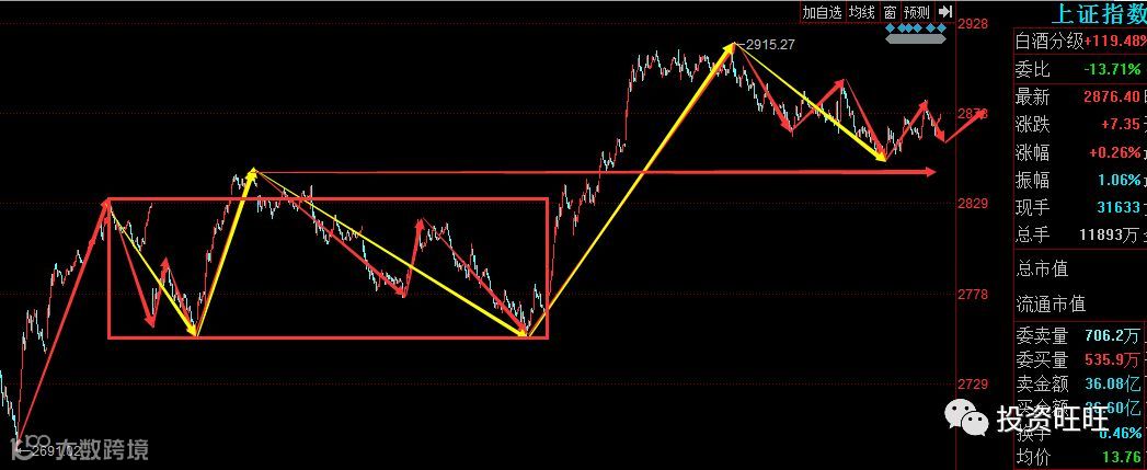 昨天我们在文章里面明确提出了从2915开始的调整五分钟级别中枢已经走出,今天预计会有机会走出一笔上,前期中枢的最高点在2845点,顶部在2828点,今天继续小幅回调后出现了我们预期当中的中枢反弹笔,只是力度不强,预计这笔上还是以线段形势弱势反弹上去,上方的压力位在2900附近,五分钟三买构建成功理论上有机会出新高,不过目前市场资金进场意愿不足,预计行情会有反复。