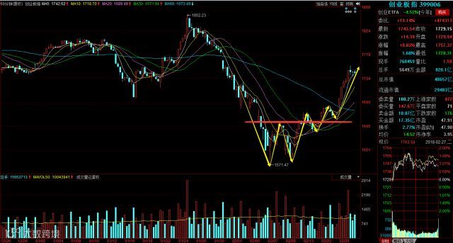 创指昨日受注册制延期等消息利好大幅反弹收长阳柱,今日早间开盘行情继续冲高,延续昨日上涨行情,截止收盘放量收中阳柱。