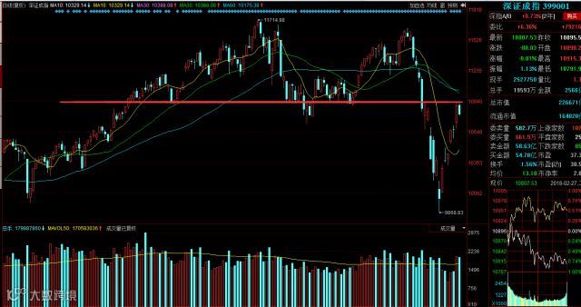 深成指今日同样高位回落,在10940附近处受到承压,收出一根中阴柱。