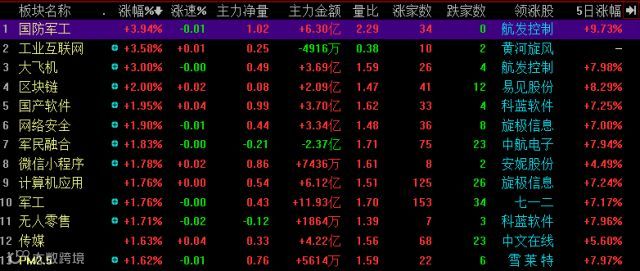 今日军工板块盘中有所异动,以国防军工、工业互联网、大飞机、区块链等排在涨幅居前,而资源类权重板块煤炭、水泥、钢铁、银行等集体回落。