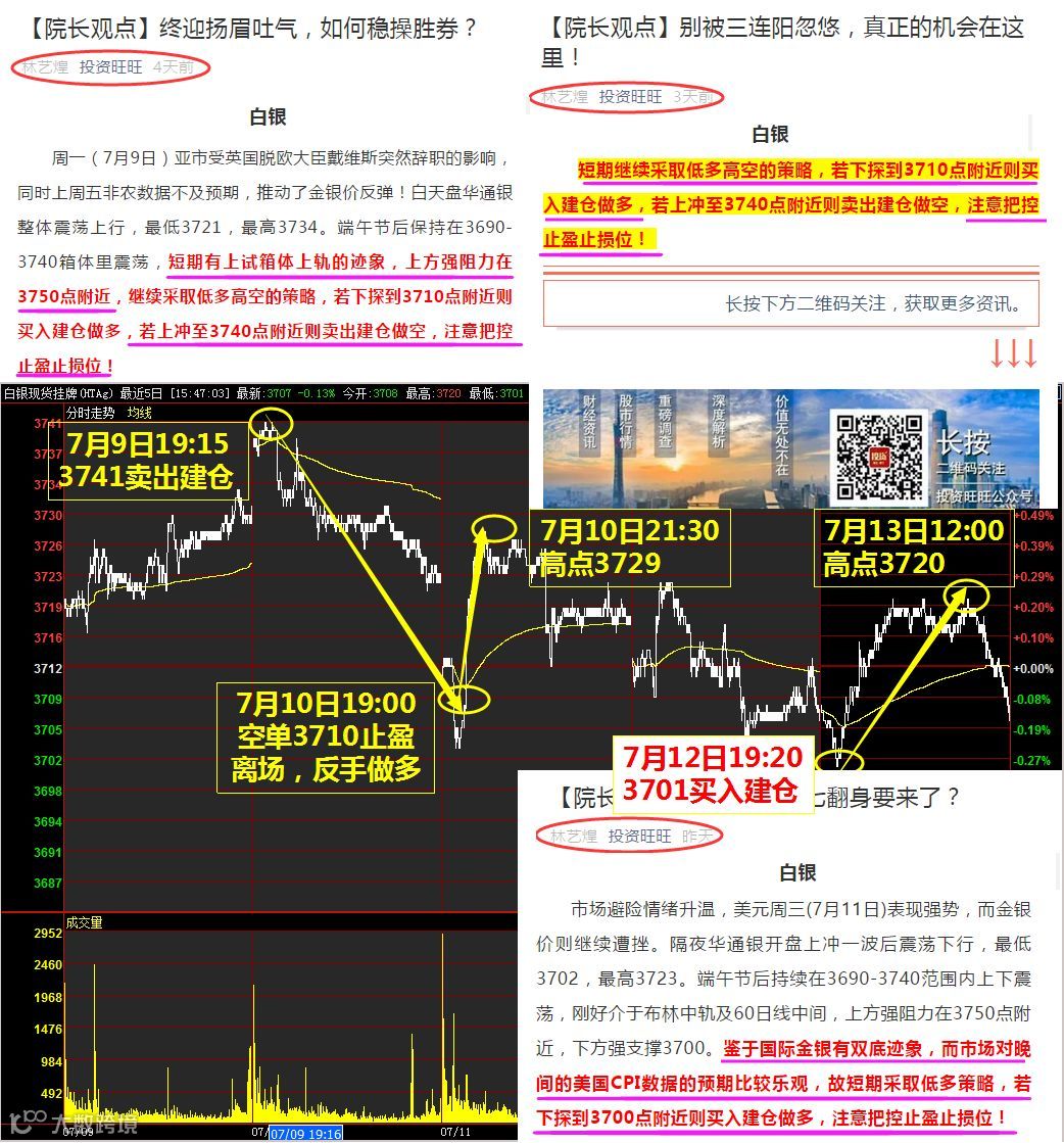 上日美国公布的CPI良莠不齐,美元冲高回落,金银则趁机反弹。隔夜华通银开盘上冲一波后震荡下行,最低3701,最高3720。端午节后持续在3690-3740范围内上下震荡,刚好介于布林中轨及60日线中间,上方强阻力在3750点附近,下方强支撑3700。回顾本周震荡区间高抛低吸操作,收获还是不错的: