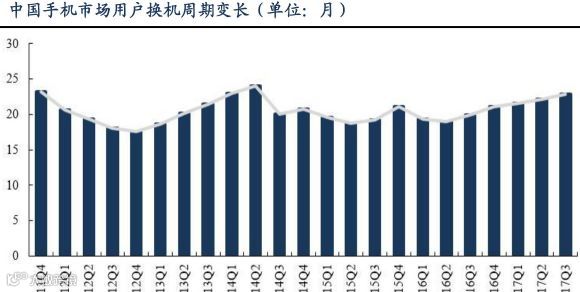 零组件涨价传递到终端,消费者并不会简单地为手机提价买单,即使是产品升级和创新应用引起的价格提升,消费者也是三思而后行。通常来说,围绕光学的升级、创新消费者更容易接受,因为感受更直观,而结构件升级、成本大幅提升下的屏幕升级吸引力并不强。根据赛诺数据,中国手机市场用户换机周期从16年第二季度开始持续拉长,16年第二季度为19个月,17年第三季度拉长为22.9个月。