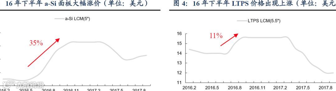 从屏幕看,三星LG纷纷关掉了a-Si产线,京东方、天马等a-Si产能持续向专业显示转移,中小尺寸a-Si面板出现较大供给缺口,群智咨询数据,16年下半年5寸a-Si模组价格上涨35%以上,部分需求向LTPS转移后LTPS模组价格上涨幅度也在10%以上。升级为OLED屏,价格上升则更为明显,根据IHS数据,三星的柔性OLED屏价格在110美金左右,刚性OLED屏价格在40美金左右,屏幕成本的上升已经成为整机成本增加的最主要原因之一。