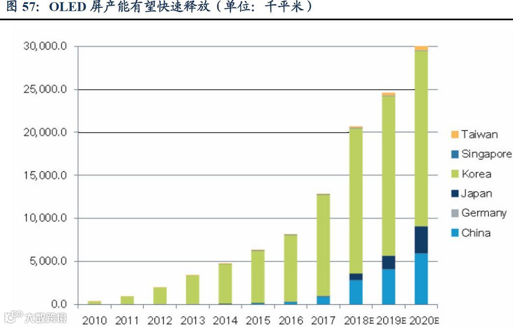 OLED,LTPS价格的快速下滑也带动了刚性OLED面板的降价,未来刚性OLED价格和LTPS价格关联性较强。柔性OLED价格维持高位,很大程度上是由三星垄断地位所致,根据供应链调研结果,上半年由于iPhone X销量低迷,导致三星柔性OLED产线稼动率下降,三星预计降价10%左右以获得更多订单。同时,随着国产面板厂商OLED产线的放量,预计柔性OLED 19年价格有望下降20%以上,并且尽快回归合理区间。