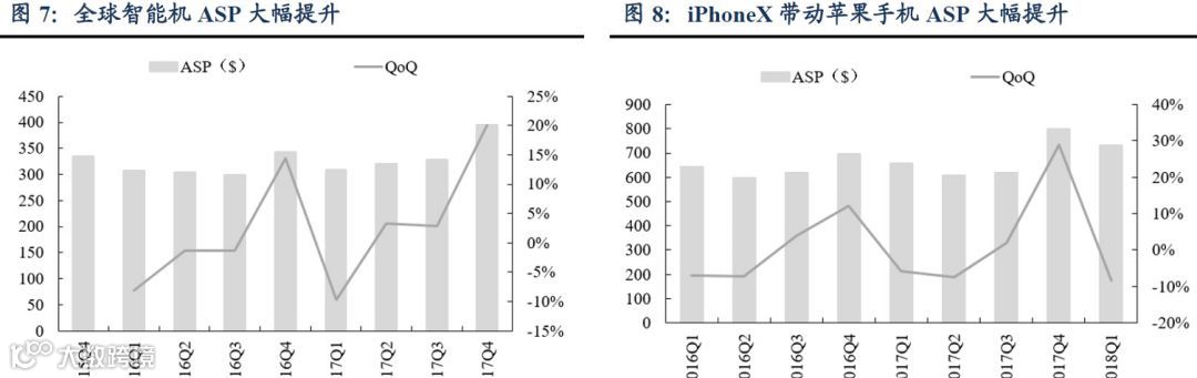 从存储来看,也是成本大头。NAND Flash方面,由于三星、美光等大厂从2D NAND向3D NAND制程转移,NAND Flash产能出现较大缺口,从16年6月开始部分产品一年内涨价幅度高达54%;DRAM方面,由于下游服务器等需求旺盛,而三星、海力士、美光等大厂并未大幅增加产能,较大供需缺口下部分DRAM的ASP一年内涨幅超过84%。经历这轮缺货引起的涨价后,大部分零组件价格都处于高位,同时叠加产品升级和创新应用的增加,带动手机ASP快速提升。根据GFK数据,17年第四季度全球智能机ASP已经达到394美元,同比增加52美元;增长最为显著的要数iPhone,在iPhone X带动下,苹果手机2017年第四季度ASP高达796美金,同比大幅增加102美金。